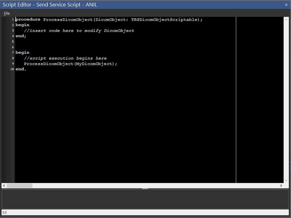The Script Editor window allows the ability to create custom scripts to modify the DICOM object being received from the selected station. The Script Editor utilizes Pascal scripts. The following is a list of available functions to use when creating custom scripts.
