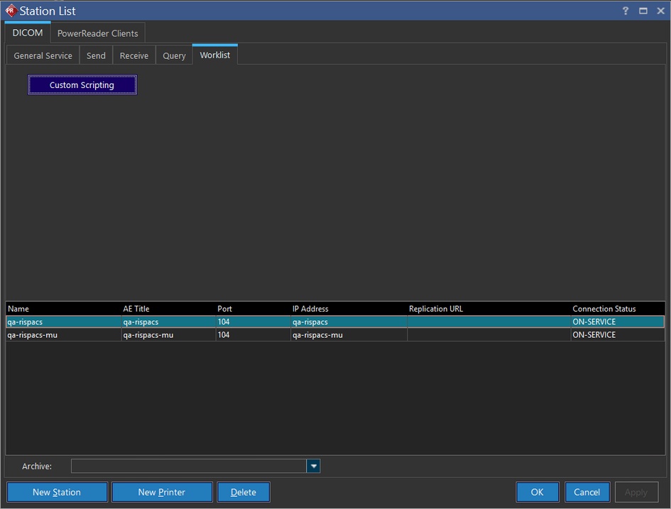 For PowerReader release PRU-8 or higher, the Station List consists of an additional Worklist Tab for inserting Custom Scripting. Custom Scripting in the Worklist tab allows for customizations of DICOM Modality Worklist and regular C-FIND request datasets.