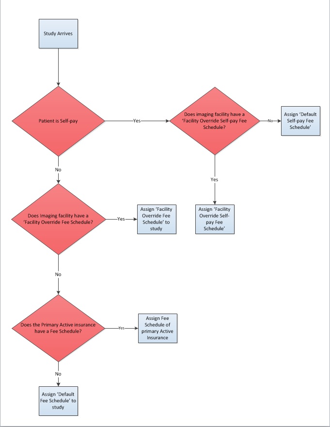 This diagram shows the logic used by RamSoft software to assign a 'Fee Schedule' to a patient.