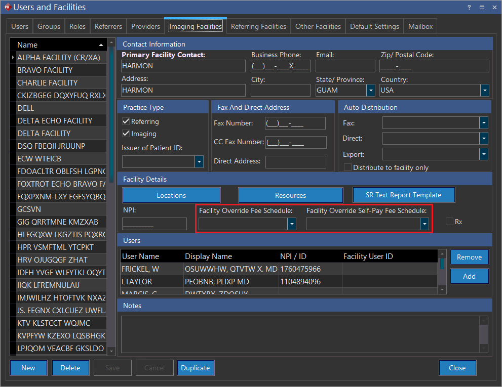 2. Click Facility Override Fee Schedule or Facility Override Self-Pay Fee Schedule drop-down menu. The fee schedule chosen here will be used by the facility.