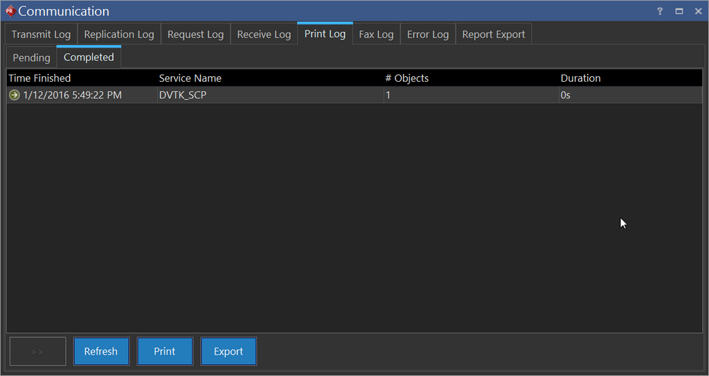 The RamSoft software maintains a list of all the studies that are currently being printed, are queued up to be printed, or have been printed in the past. This list is accessible by clicking Settings > Logs > Communication > Print Log tab.