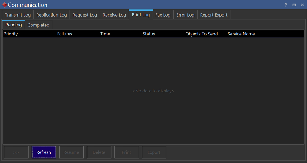 The Print Log is composed of two sections. The first section is found under the Pending tab. This section contains a list of all the studies that are currently being printed, have been queued up to be printed, or have failed.
