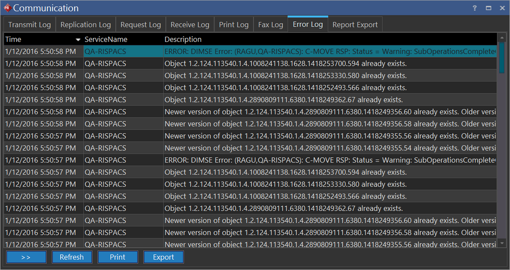The RamSoft software maintains a list of all the errors and warnings that occurred during DICOM communication with other systems.This list is accessible by clicking Settings > Logs > Communication > Error Log tab.