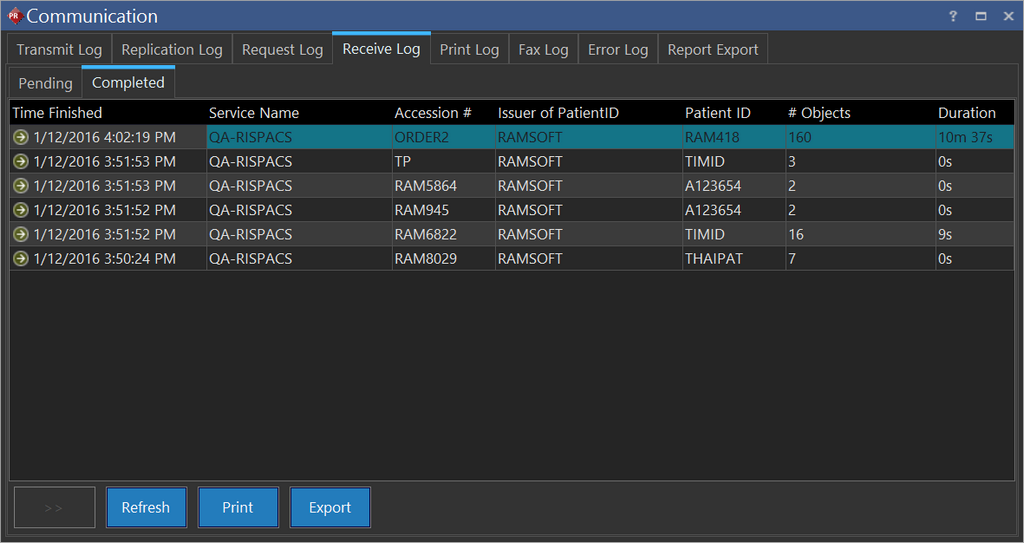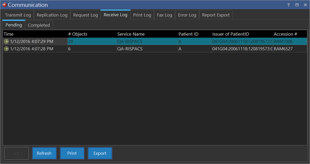 Only objects that have been successfully received will appear in this log. Since these are all incoming objects, there will be overlap with entries found in the Request Log. Any studies that have been requested and received will appear in both the Receive Log and the Completed tab of the Request Log.