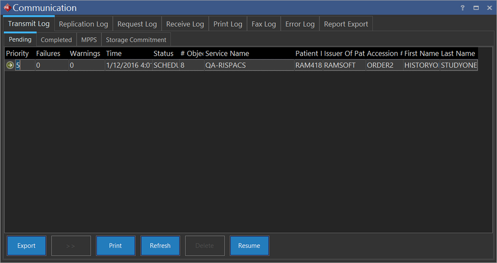 If an MPPS transfer failed, it can be manually restarted by highlighting it and then clicking on the Resume button. An MPPS of a study can be deleted from the MPPS Pending Log by selecting the study and clicking on the Delete button.