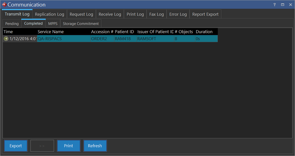 The RamSoft software maintains a list of all the studies that are currently being transferred, are queued up to be transferred, or have been transferred out of the system. This list is accessible by clicking Settings > Logs > Communication > Transmit Log tab.