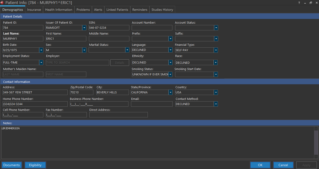 The Patient Registration form displays information about the patient, their contact information, and insurance information.