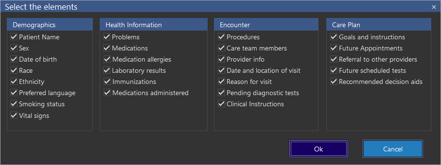 The Summary button opens the Select the elements screen as shown below. It has four sections such as Demographics, Health Information, Encounter, and Care Plan. In turn all sections has various options which can be checked or unchecked based on the business requirement. The value of any option which ever is unchecked will be not be displayed in the clinical summary.