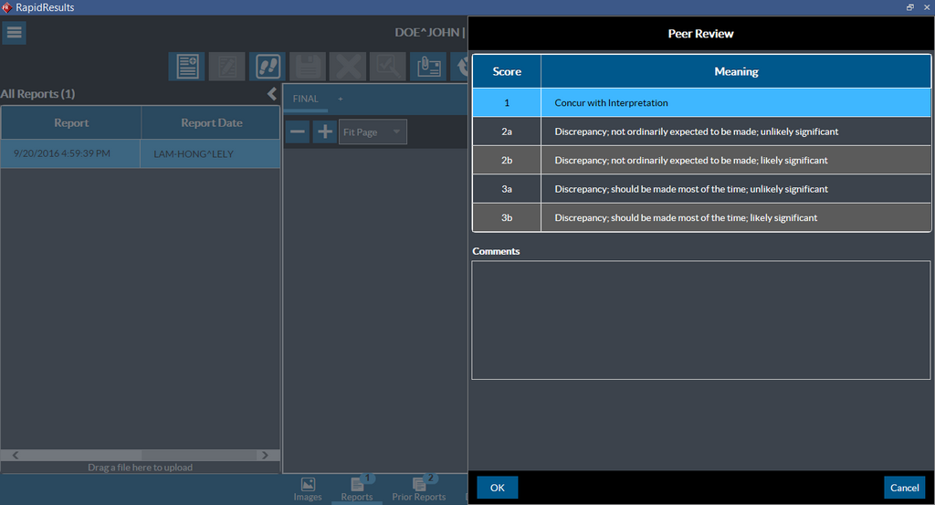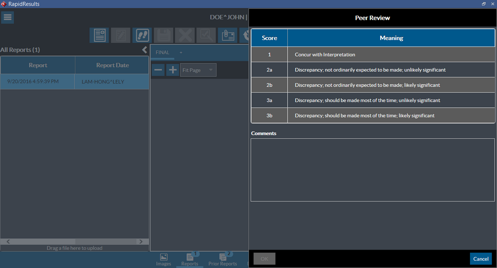 To submit your Peer review score to ACR RADPEER, you need to have PowerReader integration with RADPEER enabled. For more information on enabling integration with RADPEER, please refer ACR RADPEER Integration.