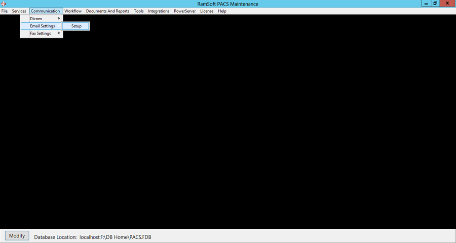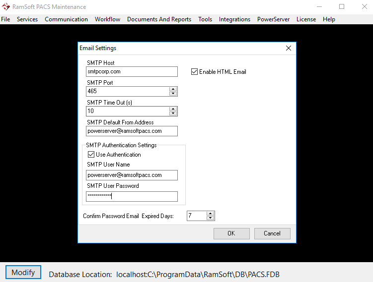 The RamSoft software allow reports to be sent through Email. In order to set up the Email connection, the SMTP server settings must be set up and a template must be created. The Email Settings can be accessed from Communication > Email Settings menu.