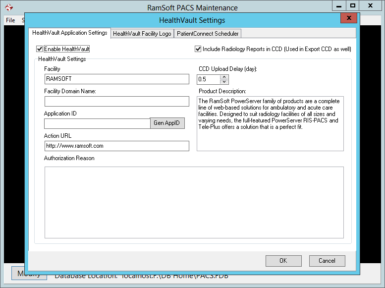 The Enable HealthVault option is used to enable/ disable HealthVault. The Include Radiology Report in CCD option will include diagnostic reports in the CCD in addition to the other information. The HealthVault Settings subsection contains the Name of the Provider/ Facility, and the Facility Domain Name. This is used for the location of the Facility specifically. The two options are needed to generate a unique Application ID for the provider. The Gen AppID button is pressed to generate the Application ID which is unique to the facility and is used by HealthVault to identify the particular Provider which is attempting to upload the CCD. The Action URL is the URL displayed when the user logs into their HealthVault Account.
