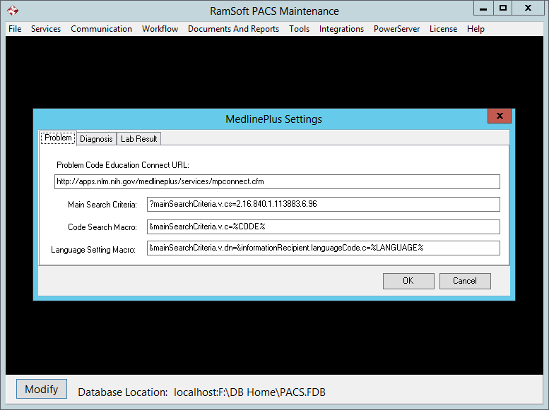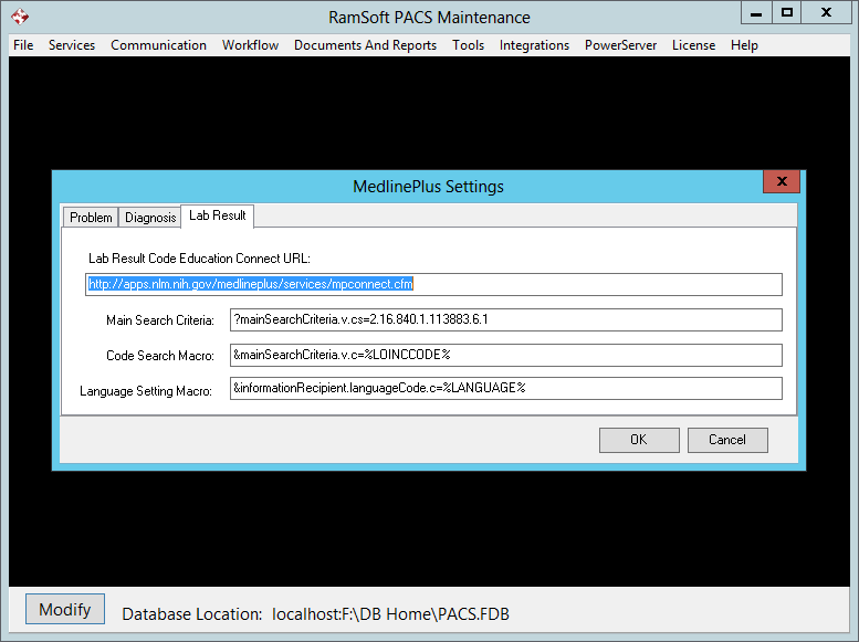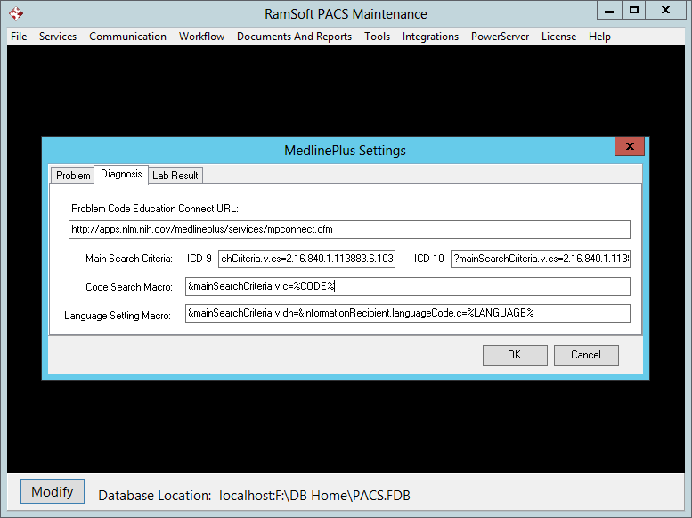 RamSoft PowerServer 6.0 allows users to provide information to the patient regarding a specific diagnosis / lab test they have. The users can click on specific links which opens a webpage from MedlinePlus. The page contains specific information regarding the diagnosis code (CPT, ICD-10 codes) or a lab test result (LOINC code).