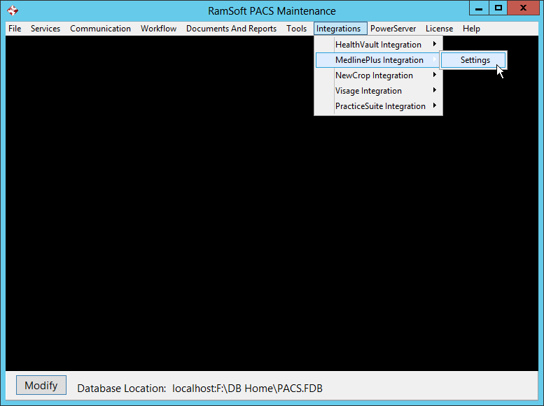 The settings for MedlinePlus are accessed through Integrations > MedlinePlus Integration > Settings.