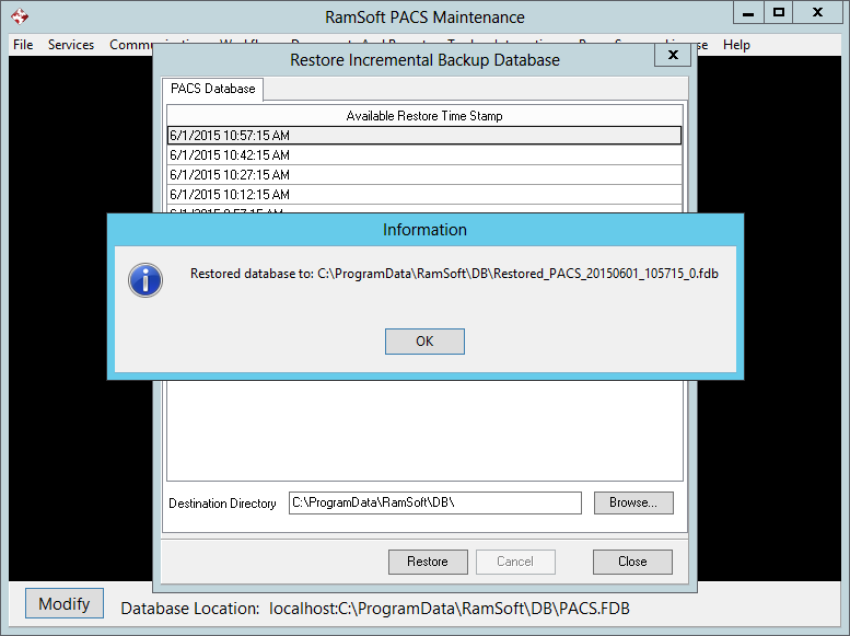 A message is displayed describing the name of the restored file. The file is named as Restored_PACS%date%%Time%%BackupLevel%.fdb.