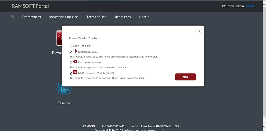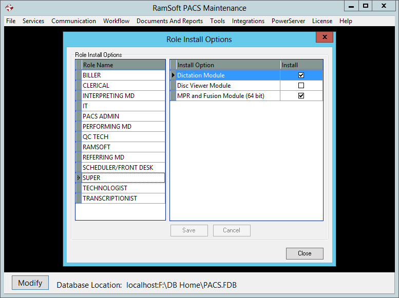 Ramsoft software has the ability to install various modules or options which are associated with a role. The system allows the user to install the Dictation Module, Disc Viewer Module and the MPR and Fusion Module for a particular role. Installing these various modules is very easy as the user only needs to click on a role and then select the Installation Options listed.