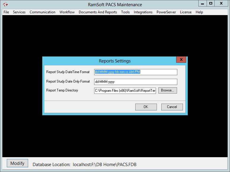The Report Temp Directory field is used to store temporary files which are generated when MS Word files are converted into PDF files. To select the temp folder, click on Browse button and then select the ReportTemp folder inside the RamSoft folder. Any temp files generated inside this folder are automatically deleted by the system.