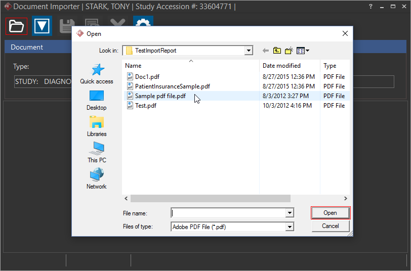 | Allows you to open a PDF document or an image (.jpg, .jpeg,.tif, .tiff, .png and .bmp) from your computer. Select a document or an image that you want to open and click the Open button to attach the document to a Study. | |