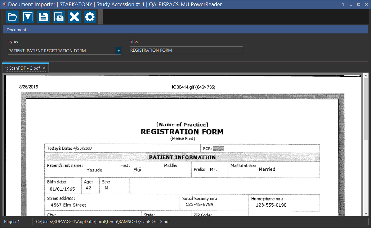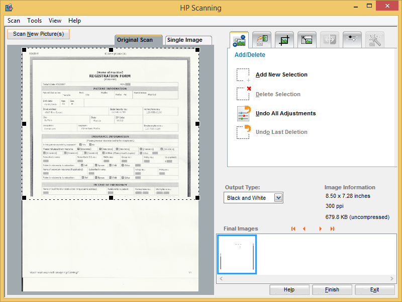 For example, in this case, a patient form has been scanned with a Resolution of 300 DPI and Quality as Black and White. The driver for the scanner selected is TWAIN32.
