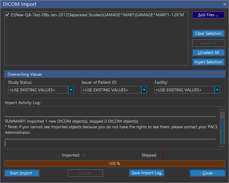 Skipped: Denotes that if any of the DICOM files were been already imported in the database or not a valid DICOM file.