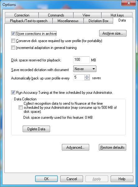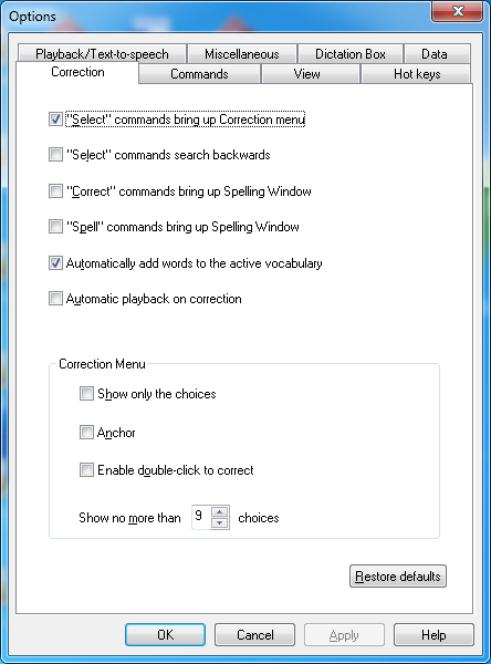 - The Options form consists of various tabs including Text-to-speech, Correction, Miscellaneous, Commands, Dictation Box, View, Data, and Hot Keys.