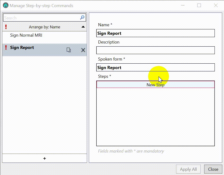 On the Manage Step-By-Step Commands screen, set a name & the spoken form you want to use to execute that command. Then Click on New Step & select hotkey. To assign the hot-key simply press it on your keyboard (For example, the shortcut for signing a report in PowerReader is Ctrl+F5:). Press Apply All to save your command.