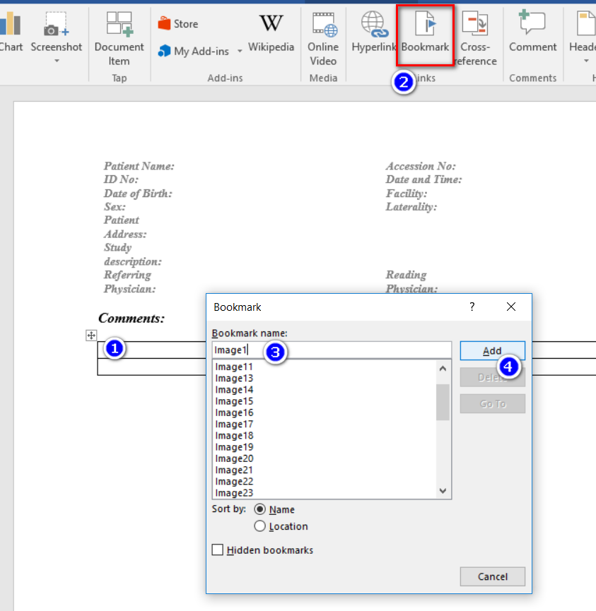 2. Via the "Insert" tab, insert the name of the first Image Bookmark as appropriate and click "Add".