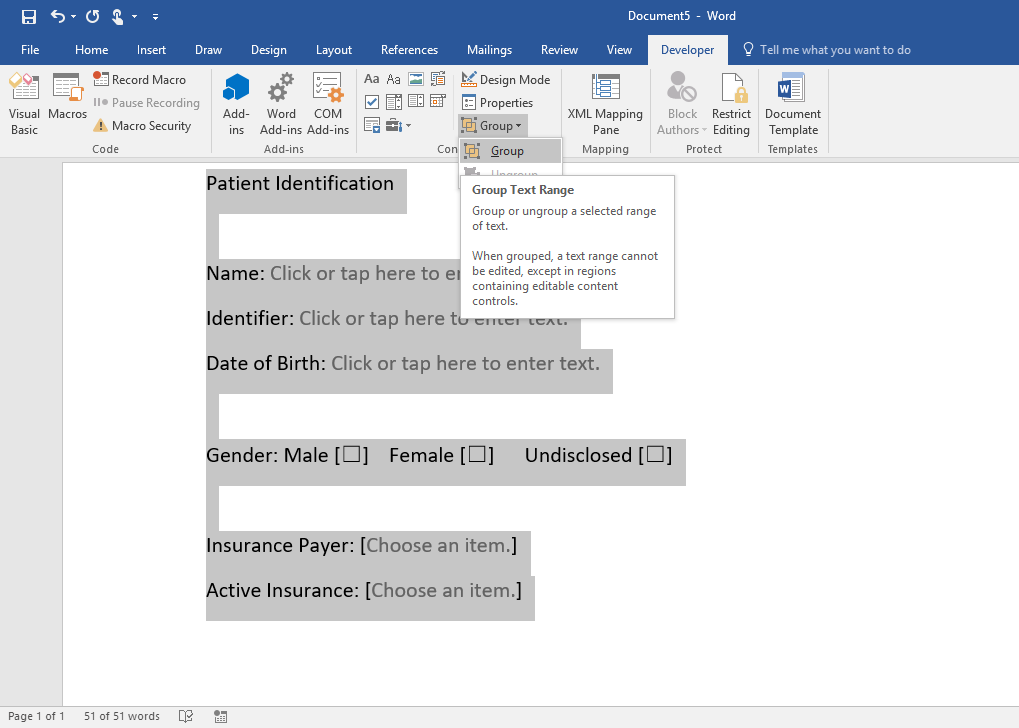 2. On the Developer tab, in the Controls group, click Group, and then click Group again. When grouped, the section cannot be edited, except in regions containing editable content controls.
