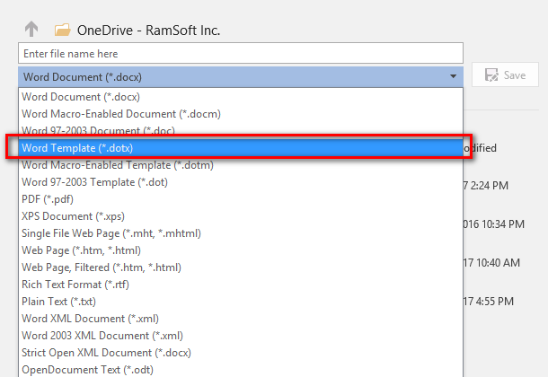 4. In the Save As dialog box, type a file name for the new template. Select Word Template and then click Save