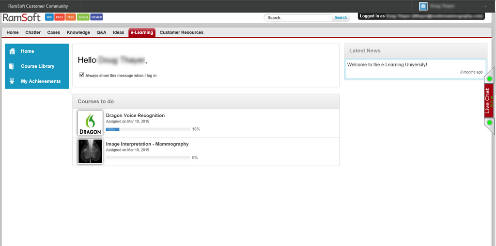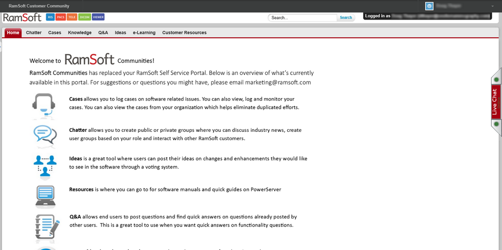 Clicking the E-Learning option will launch the RamSoft Customer Community login page in the web browser.