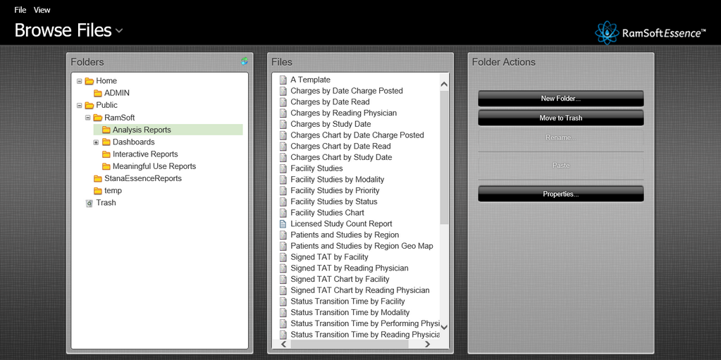 RamSoft Essence generates various types of report such as Analysis, Interactive, Dashboard, and Meaningful Use reports. These reports contain information in regards to how long studies were at each study status, how many studies were processed per facility or physician, how much time each Radiologist, Transcriptionist or Technologist spent on the study, the study count and the reports that can be scheduled to be generated automatically.