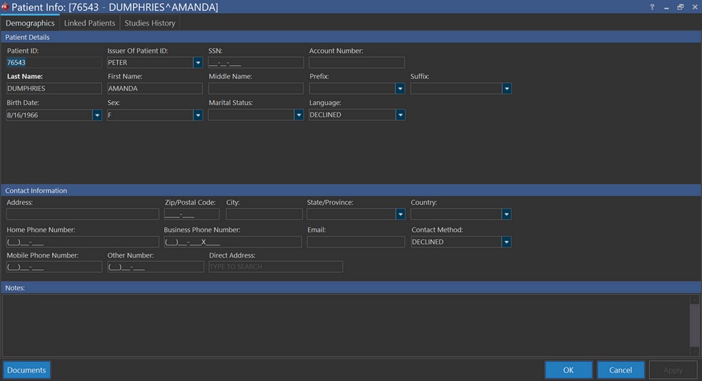 Note that when you edit any fields in the Patient Info form, there may be a slight delay of a few seconds for this update to reflect on the Worklist/Search screens and on Patient Explorer.