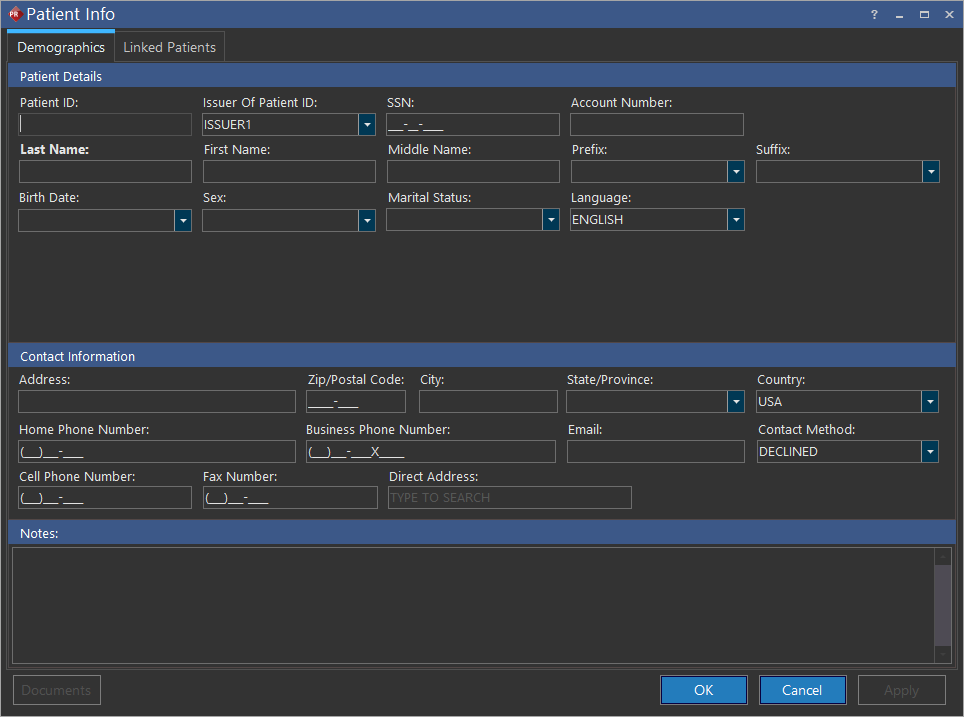 Enter the patient's information. Only the Last Name field is required. All other information is optional, although it is recommended to complete as many fields as possible. A patient's date of birth can be entered as far back as 1/1/1800. Any birth date older than 1/1/1800 is not allowed.