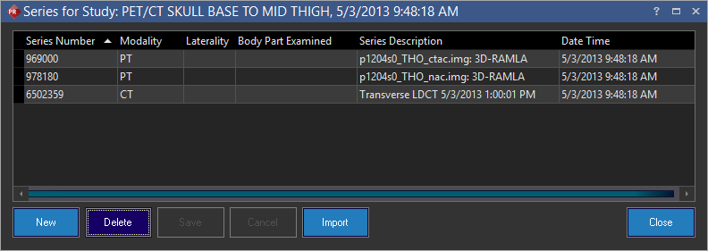The Series form contains a list of the series pertaining to the study. Access the Series for a Study by clicking the Series button on the Study Info screen.