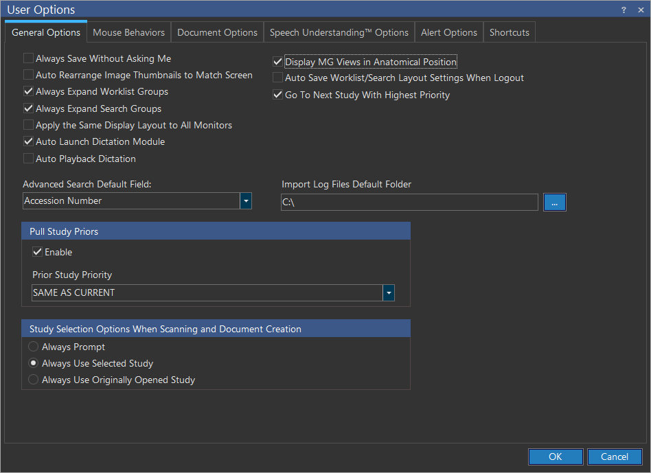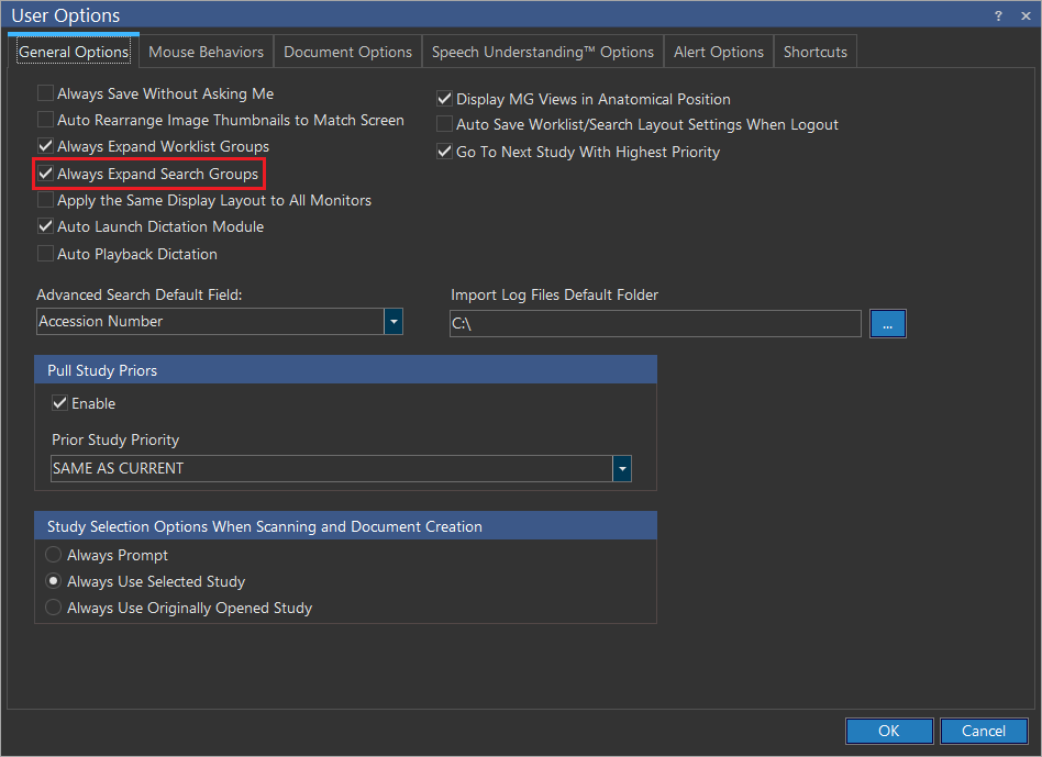 The advanced search feature has 19 search fields which includes 15 fields already available in the Search tab. In addition to this, four search criteria has been addressed. By default, the cursor is on Accession number field. To change the default field setup of the cursor, click Settings > User Options > General Options tab and then choose the desired option in the Advanced Search Default Field drop-down menu. Click OK.