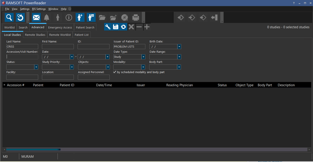 The Search tab could be accessed from the PowerWorklist. Search tab appears as shown below.