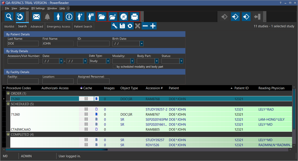 Note that the Open the selected study, Write the study to a disc, Print the study list and Create a new study for this patient icons are enabled only when a study is selected in the Search or Worklist grid.