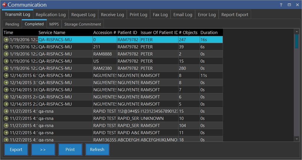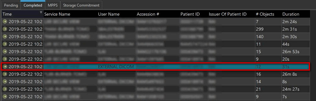 Note that the User Name "External DICOM" in the Transmit Log (below) indicates that the request came from a C-MOVE request by another device.