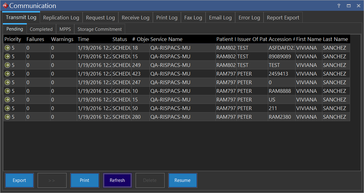 The Transmit Log is composed of two sections. The first section is found under the Pending tab. This section contains a list of all the studies that are currently being DICOM Pushed, have been scheduled for a DICOM Push and are queued up, or have failed.