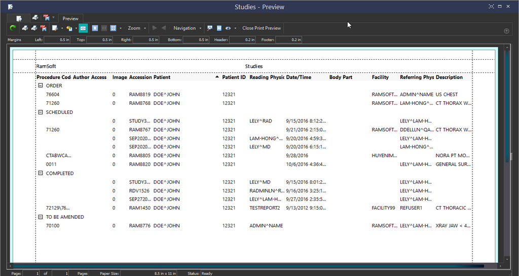 When the contents of a Worklist or a search need to be saved, the report can be printed or exported to a file. To do this, click the Print the study list icon found on the Worklist. This will open up a preview that contains the report of all the studies currently on the Worklist.