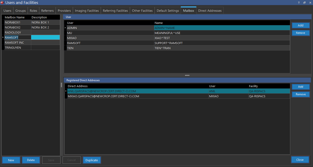 - Add the users and direct addresses under "User" and "Registered Direct Addresses" sections respectively. The users who have been added can use the direct addresses to send and receive the direct messages in Inbox. When you duplicate a Mailbox, the direct address is not duplicated as direct address only associates with one mailbox.