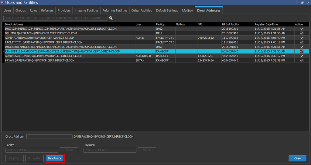 A direct address registered for a facility can be deactivated.