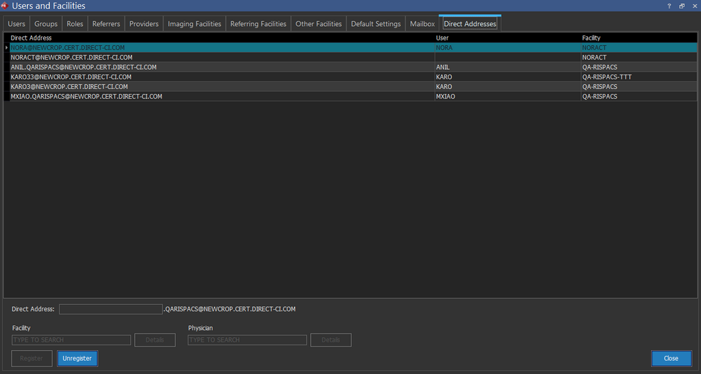Note: Only one direct address for a user per facility can be registered. When a different direct address for a user is being registered for a facility that already has a direct address registered for the user, the system will display an alert informing the user to unregister the existing direct address and register a new one.