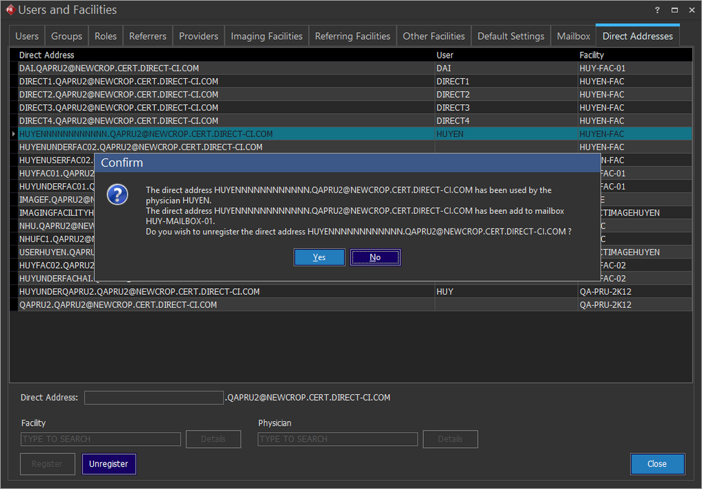 Click Yes to unregister the direct address for a physician. The direct address cannot be unregistered for a physician if it is the last registered physician direct address.
