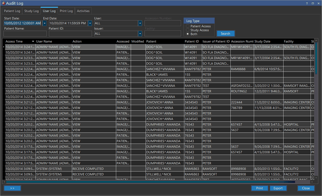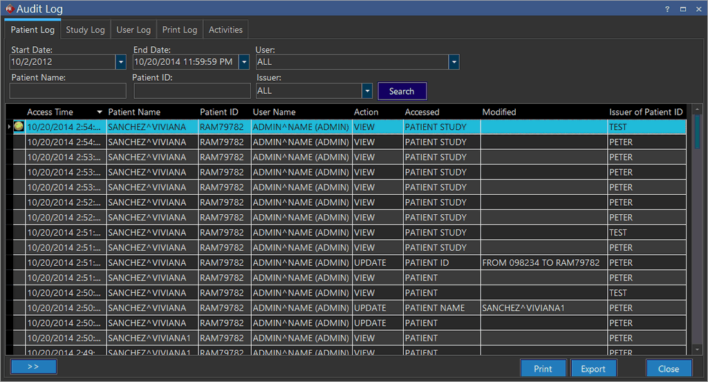 In this location, it is possible to see the Patient Log, Study Log, User Level Audit Log or a User's Print Log and Activities in one location.