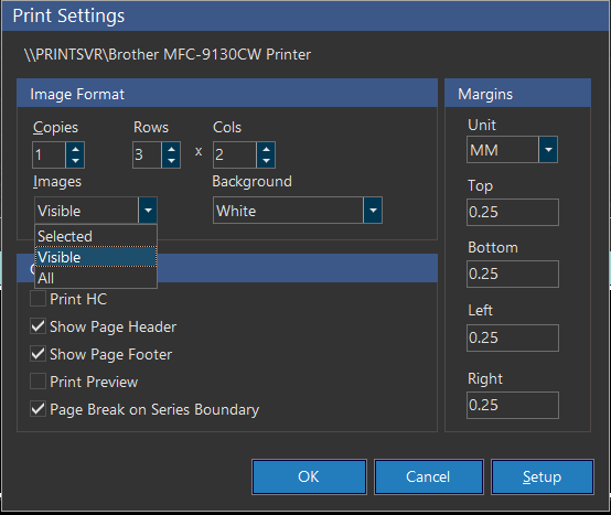 At the bottom of the settings form are additional options. Print HC enables images of HC modality to be printed. Show Page Header and Show Page Footer enable headers and footers to be shown respectively. Checking Print Preview will allow the user to preview the printed images to ensure they are satisfactory. Finally, Page Break on Series Boundary adds an additional space between different series.