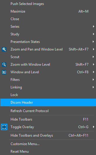The right click opens a menu containing only one option DICOM Header. Clicking it will launch the DICOM Header dialog.