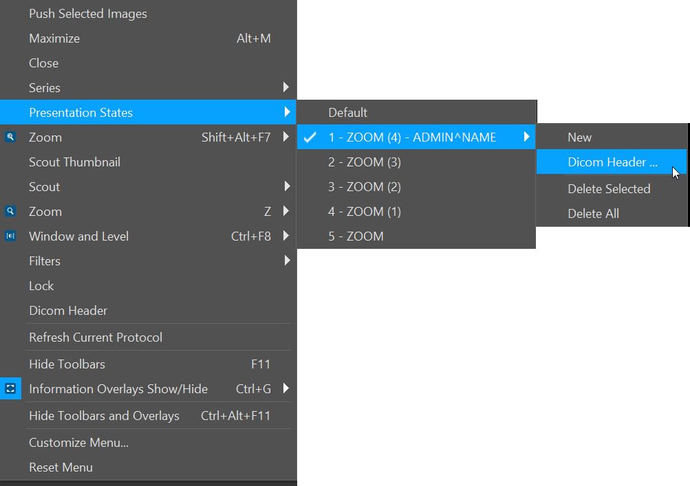 Choosing the DICOM Header option will display the DICOM Header information for the presentation state.