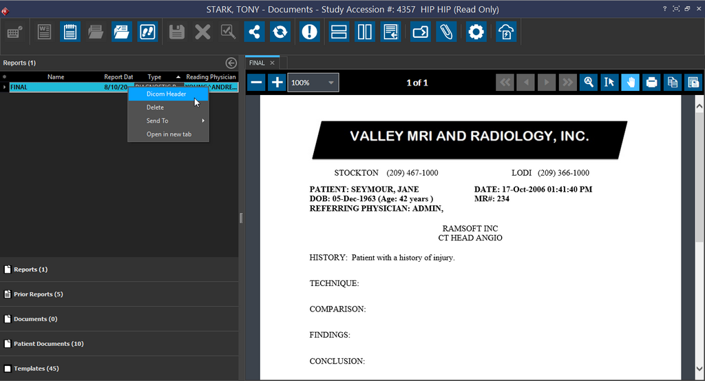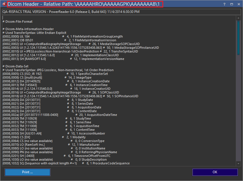 The RamSoft software allows the viewing of DICOM header data associated with any DICOM image, SR Report, AU dictation or Presentation State. The DICOM Header of any image is accessible through the Image Right Click menu.