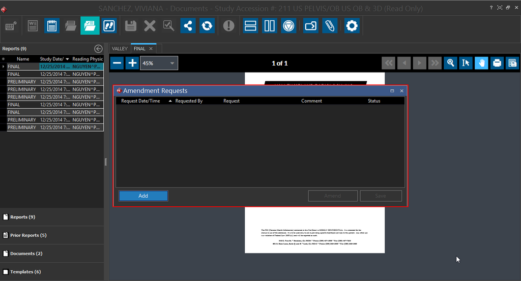 - To review the amendment requests for a study, you need to first open document viewer for that study. Select the FINAL signed report you want to amend and click the Amend Report button