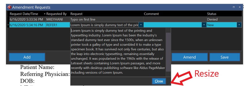- The Amendment Requests dialog box appears displaying the amendment request notes. Note that request field could be expanded by clicking on the drop-down arrow (marked by a red circle on the following screenshot):